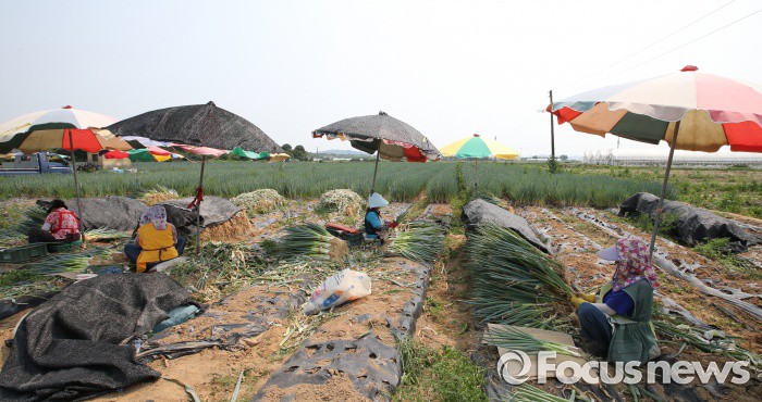 (청주=포커스뉴스) 최고기온이 30도가 넘으며 무더운 날씨를 보인 17일 오후 충북 청주시 흥덕구 들녘에서 농민들이 파를 수확하고 있다.