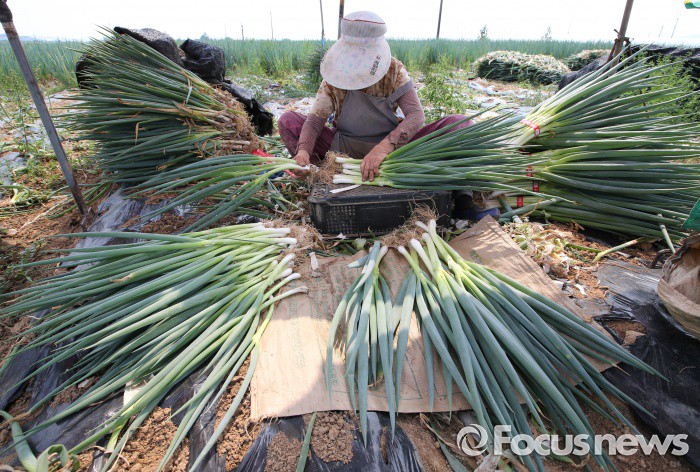 (청주=포커스뉴스) 최고기온이 30도가 넘으며 무더운 날씨를 보인 17일 오후 충북 청주시 흥덕구 들녘에서 농민들이 파를 수확하고 있다.