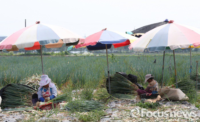 (청주=포커스뉴스) 최고기온이 30도가 넘으며 무더운 날씨를 보인 17일 오후 충북 청주시 흥덕구 들녘에서 농민들이 파를 수확하고 있다.