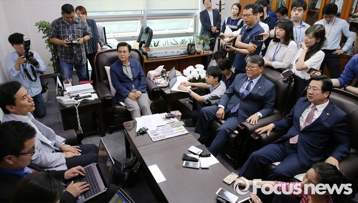 (서울=포커스뉴스) 17일 오후 서울 여의도 국회 의원회관 김태흠 새누리당 의원실에서 조원진, 이장우, 김진태, 김태흠 의원 등 친박계 의원들이 탈당파 복당 문제와 관련 논의를 하고 있다.