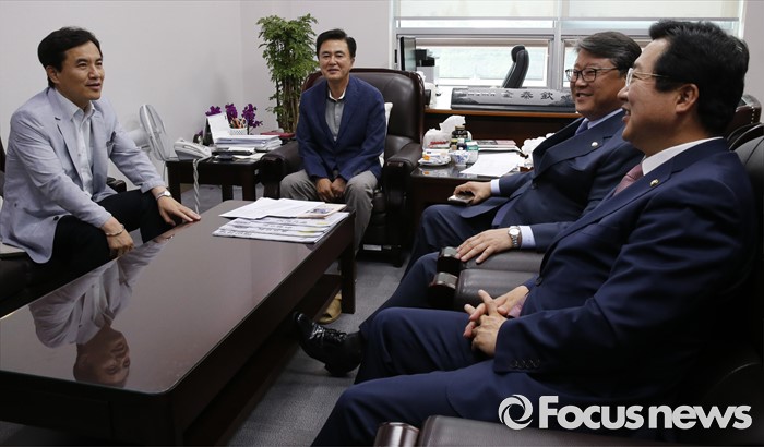 (서울=포커스뉴스) 17일 오후 서울 여의도 국회 의원회관 김태흠 새누리당 의원실에서 조원진, 이장우, 김태흠, 김진태 의원 등 친박계 의원들이 탈당파 복당 문제와 관련 논의를 하고 있다.