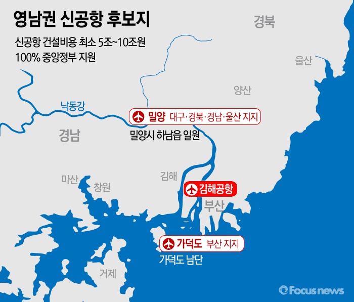 (서울=포커스뉴스) '영남권'신공항 입지 선정 결과 발표가 일주일 앞으로 다가오면서 '밀양'을 지지하는 대구·경북·경남·울산과 '가덕도'를 지지하는 부산간 경쟁이 과열되고 있다.