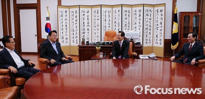 (서울=포커스뉴스) 정세균 국회의장이 17일 오후 서울 여의도 국회 의장집무실에서 3당 원내대표와 현안 논의를 위한 회동을 하고 있다. 왼쪽부터 박지원 국민의당 원내대표, 정진석 새누리당 원내대표, 정 의장, 우상호 더불어민주당 원내대표.