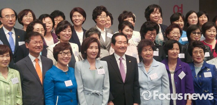 (서울=포커스뉴스) 17일 오후 서울 중구 프레스센터에서 한국여성의정 주최로 열린 20대 국회 여성 의원 어울모임에 참석한 정세균 국회의장과 천정배 국민의당 공동대표, 여야 여성 의원 등이 기념촬영을 하고 있다.