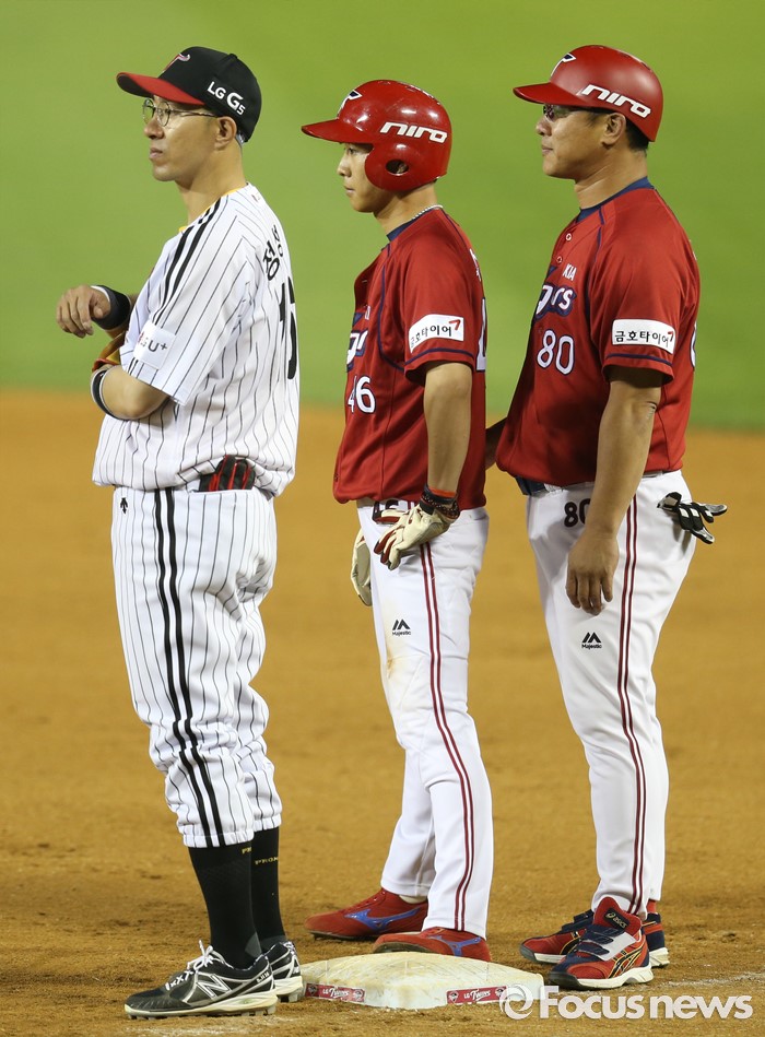 (서울=포커스뉴스) 17일 서울 잠실구장에서 열린 2016 프로야구 KIA-LG 경기 9회초 1루 베이스에 LG 정성훈, KIA 1루주자 박찬호, 김창희 코치가 나란히 서 있다.