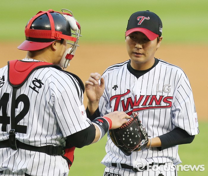 (서울=포커스뉴스) 17일 서울 잠실구장에서 열린 2016 프로야구 KIA-LG 경기 3회초 무사 1,2루에서 LG 포수 정상호가 투수 우규민에게 볼을 건네 주고 있다.