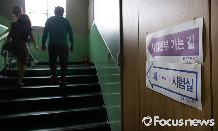 (인천=포커스뉴스) 2016년 제2회 지방공무원 임용 필기시험이 실시된 18일 오전 인천 연수구 청학공업고등학교에서 한 수험생이 시험실으로 들어서고 있다.