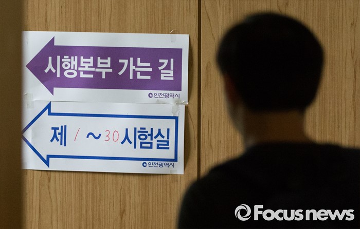 (인천=포커스뉴스) 2016년 제2회 지방공무원 임용 필기시험이 실시된 18일 오전 인천 연수구 청학공업고등학교에서 한 수험생이 시험실으로 들어서고 있다.