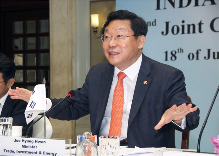 (서울=포커스뉴스) 주형환 산업통상자원부 장관이 18일(현지시간) 인도 마우라야호텔에서 나르말라 시타라만(Nirmala Sitharaman) 인도 상공부 장관(수석대표)을 비롯한 한-인도 양국 대표단이 참석한 가운데 열린'제2차 한-인도 CEPA(포괄적 경제동반자 협정) 공동위원회'에 참석해, 인사말을 하고 있다. <사진제공=산업통상자원부>
