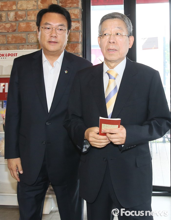 (서울=포커스뉴스) 김희옥 새누리당 혁신비상대책위원장과 정진석 원내대표가 19일 오전 서울 강남구 논현동 한 카페에서 비상대책위원회 정상화를 위한 회동을 하고 있다. 이번 회동은 지난 16일 탈당 무소속 의원들의 일괄복당을 결정한 혁신비대위 회의 과정에 불만을 제기하고 김 위원장이 칩거에 들어간지 나흘째 전격적으로 이뤄진 회동이다.