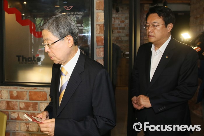 (서울=포커스뉴스) 김희옥 새누리당 혁신비상대책위원장과 정진석 원내대표가 19일 오전 서울 강남구 논현동 한 카페에서 비상대책위원회 정상화를 위한 회동을 하고 있다. 이번 회동은 지난 16일 탈당 무소속 의원들의 일괄복당을 결정한 혁신비대위 회의 과정에 불만을 제기하고 김 위원장이 칩거에 들어간지 나흘째 전격적으로 이뤄진 회동이다.