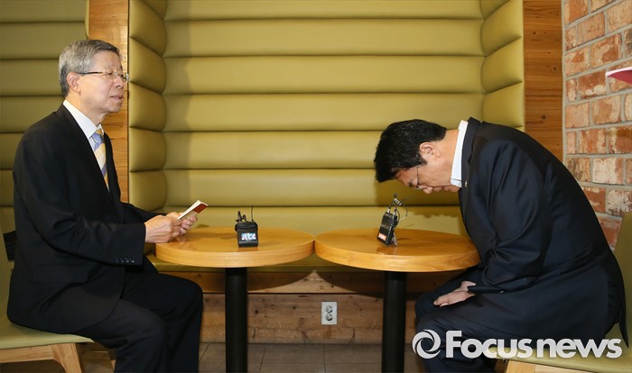 (서울=포커스뉴스) 김희옥 새누리당 혁신비상대책위원장과 정진석 원내대표가 19일 오전 서울 강남구 논현동 한 카페에서 비상대책위원회 정상화를 위한 회동을 하고 있다. 이번 회동은 지난 16일 탈당 무소속 의원들의 일괄복당을 결정한 혁신비대위 회의 과정에 불만을 제기하고 김 위원장이 칩거에 들어간지 나흘째 전격적으로 이뤄진 회동이다.