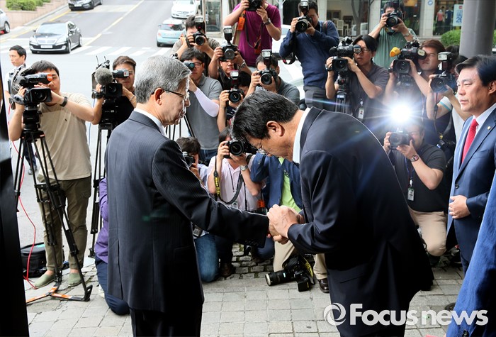 (서울=포커스뉴스) 김희옥(왼쪽) 새누리당 혁신비상대책위원장과 정진석 원내대표가 19일 오전 서울 강남구 논현동 한 카페에서 비상대책위원회 정상화를 위한 회동을 마치고 인사를 나누고 있다. 이번 회동은 지난 16일 탈당 무소속 의원들의 일괄복당을 결정한 혁신비대위 회의 과정에 불만을 제기하고 김 위원장이 칩거에 들어간지 나흘째 전격적으로 이뤄진 회동이다.