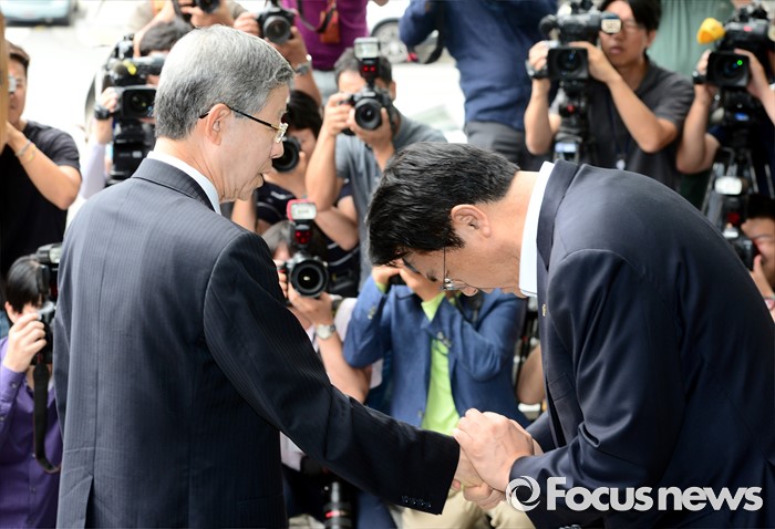 김 위원장의 당무 복귀 결정에 따라 20일로 예정된 혁신비상대책위원회는 내일 정상적으로 개최될 예정이다.(서울=포커스뉴스) 김희옥(오른쪽) 새누리당 혁신비상대책위원장과 정진석 원내대표가 19일 오전 서울 강남구 논현동 한 커피숍에서 회동을 마친 뒤 악수 하고 있다. 2016.06.19 강진형 기자