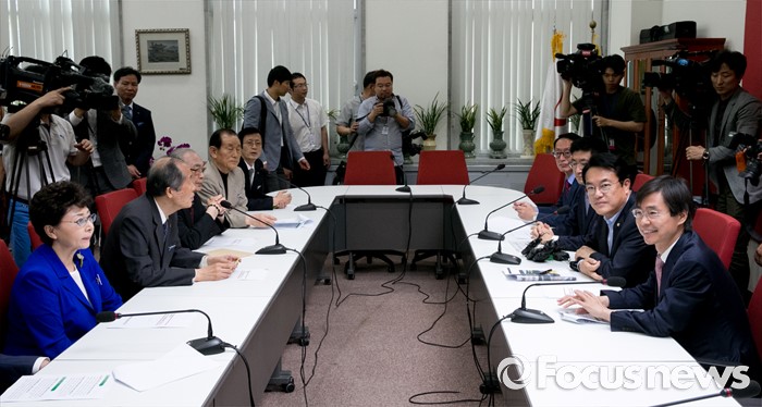 한편 영남권 신공항 입지 선정 결과 발표가 24일로 예정돼 있는 가운데, 가덕도를 지지하는 부산과 밀양을 지지하는 대구·울산·경북·경남 간 갈등이 고조되고 있다.(서울=포커스뉴스) 정진석 새누리당 원내대표와 의원들이 1일 오전 서울 여의도 국회에서 김해공항가덕이전시민추진단과 면담을 하고 있다. 2016.06.01 박동욱 기자