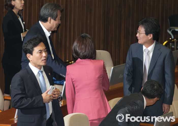 (서울=포커스뉴스) 20일 오전 서울 여의도 국회에서 열린 343회 국회(임시회) 3차 본회의에 참석한 김무성(왼쪽) 새누리당 전 대표와 유승민 의원 등이 인사하고 있다.