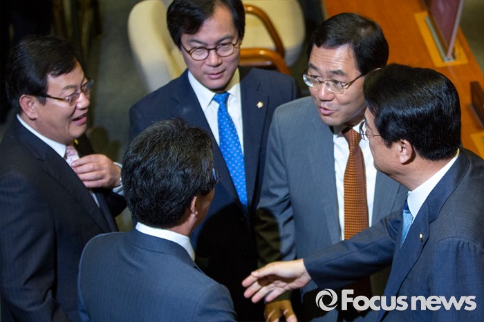 (서울=포커스뉴스) 정진석(오른쪽) 새누리당 원내대표표 및 주호영(오른쪽 두 번째) 무소속 의원, 유승민 새누리당 의원이 20일 오전 서울 여의도 국회에서 열린 본회의에 참석해 인사 하고 있다.