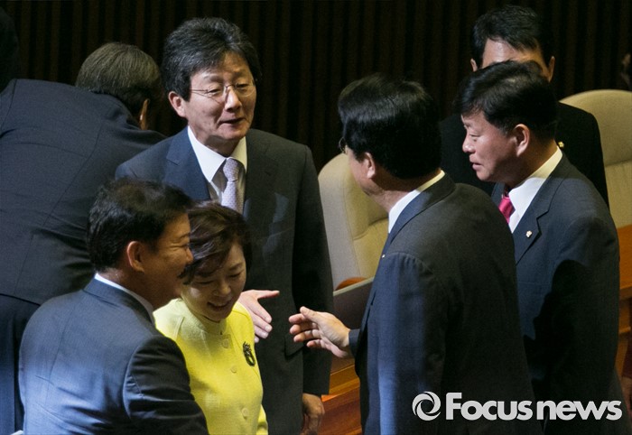 (서울=포커스뉴스) 20일 오전 서울 여의도 국회에서 열린 343회 국회(임시회) 3차 본회의에 참석한 정진석 새누리당 원내대표가 교섭단체 대표연설을 마친 뒤 유승민 의원과 악수하고 있다.