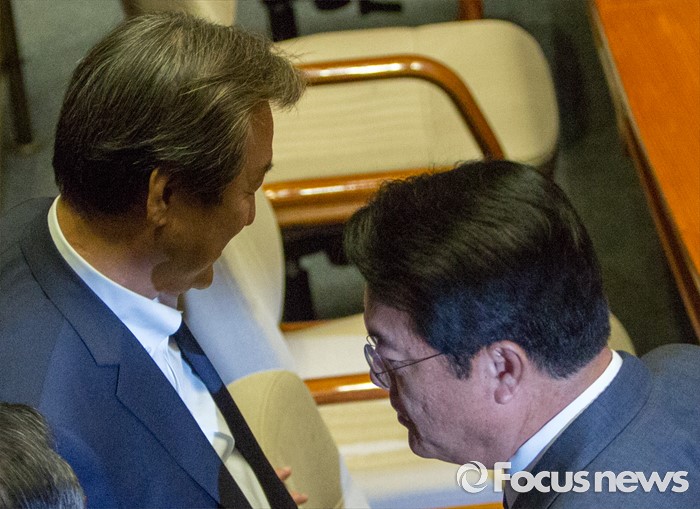 (서울=포커스뉴스) 정진석(오른쪽) 새누리당 원내대표와 김무성 새누리당 전 대표가 20일 오전 서울 여의도 국회에서 열린 본회의에 참석하고 있다.