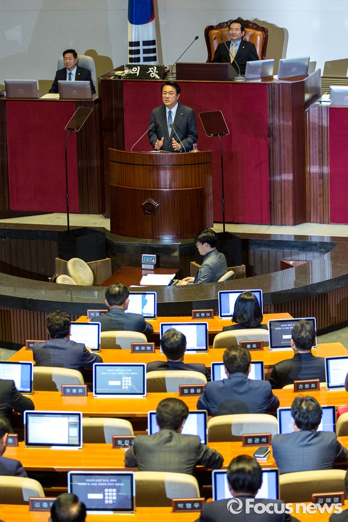 (서울=포커스뉴스) 정진석 새누리당 원내대표가 20일 오전 서울 여의도 국회에서 열린 본회의에 참석해 교섭단체 대표연설을 하고 있다.
