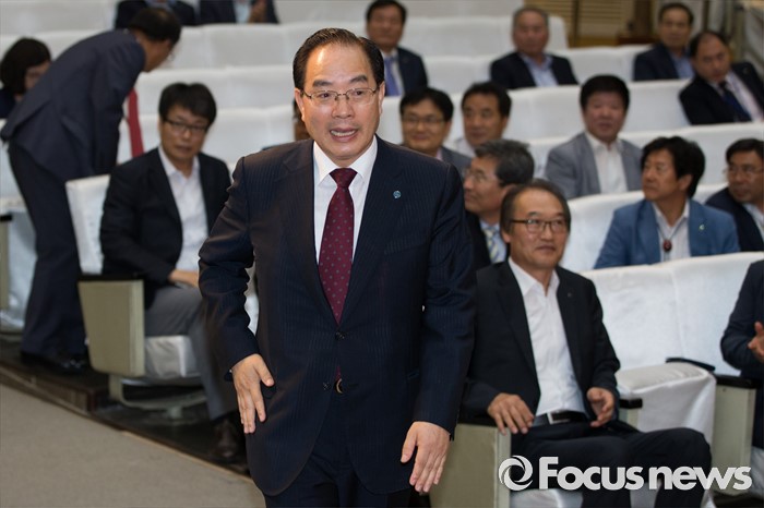 (서울=포커스뉴스) 20일 오전 서울 서초구 한국교원단체총연합회에서 열린 제36대 한국교총 회장선거 개표 및 당선자 발표에서 회장으로 선출된 하윤수 부산교대 총장이 들어서고 있다.