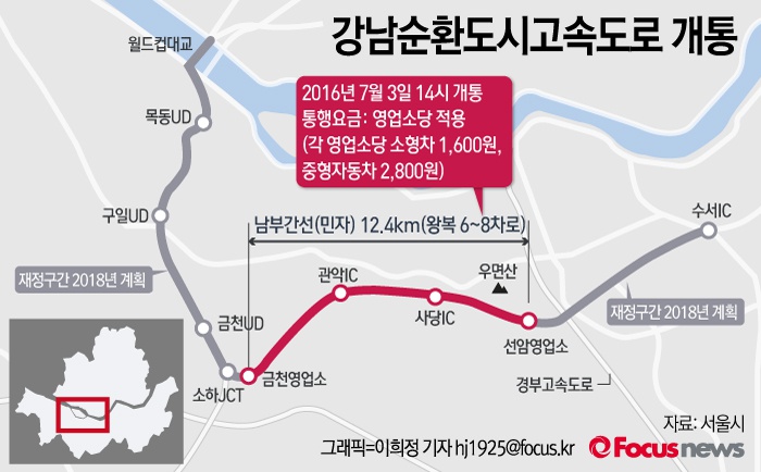 (서울=포커스뉴스) 서울시는 20일 서울시청에서 강남순환로 개통 기자설명회를 개최하고, 7월3일 14시 강남순환로 1단계 구간 13.8㎞를 개통한다고 밝혔다. 1단계 구간은 △민자구간 12.4㎞ △민자구간과 연계되는 일부 재정구간 1.4㎞로 이뤄진다.