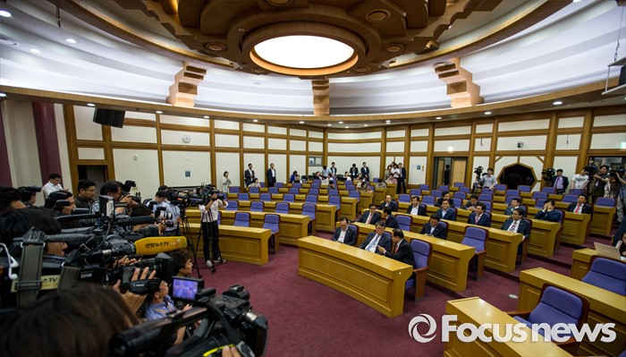 (서울=포커스뉴스) 조원진(오른쪽 두 번째) 새누리당 의원을 비롯한 친박계 초재선 의원들이 20일 오후 서울 여의도 국회의원회관에 모여 간담회 시작을 기다리고 있다.