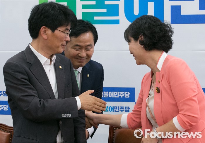 (서울=포커스뉴스) 박완주(왼쪽부터) 더불어민주당 원내수석부대표, 김관영 국민의당 원내수석부대표, 이정미 정의당 원내수석부대표가 20일 오후 서울 여의도 국회에서 현안 관련 야3당 원내수석부대표 회동에 앞서 인사하고 있다.
