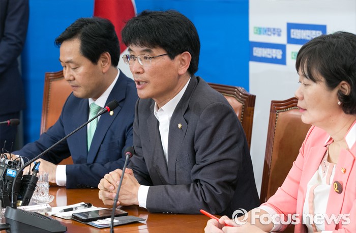 (서울=포커스뉴스) 박완주(가운데) 더불어민주당 원내수석부대표, 김관영(왼쪽) 국민의당 원내수석부대표, 이정미 정의당 원내수석부대표가 20일 오후 서울 여의도 국회에서 현안 관련 회동을 열고 취재진에게 설명하고 있다.