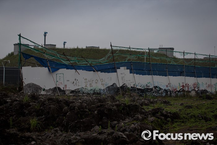 (제주=포커스뉴스) 서귀포시가 제주해군기지 크루즈터미널 조성공사를 이유로 해군기지 건설 반대운동에 사용해 온 망루 등 시설물들을 자진 철거하라는 3차 계고장을 강정마을회에 보내 행정대집행이 예고되고 있다. 20일 오전 제주 서귀포시 강정마을 멧부리에서 해군기지 철조망 벽면에 해군기지 건설을 반대하는 사람들의 메시지가 새겨져 있다.