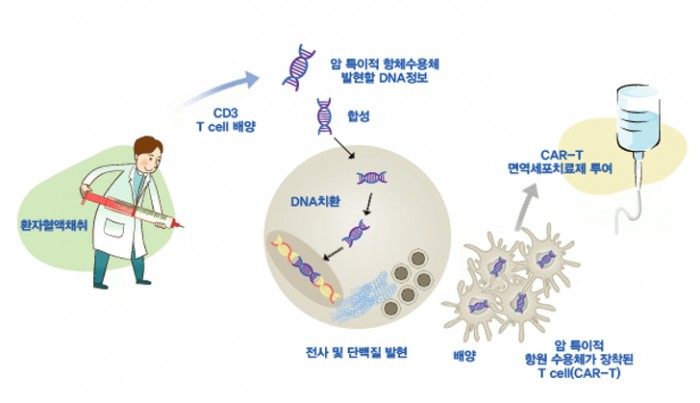 CAR-T세포는 환자의 혈액에서 T세포를 추출한 뒤 바이러스 벡터를 이용해 암세포 특이적 키메릭 항원 수용체로 디자인된 DNA를 T세포에 주입하고, 이 세포를 증식시켜 환자에게 다시 주입하는 복잡한 과정을 거쳐야 한다.