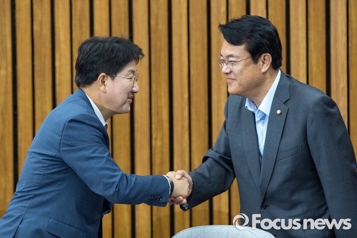 | △ 악수하는 정진석 원내대표-권성동 사무총장 |