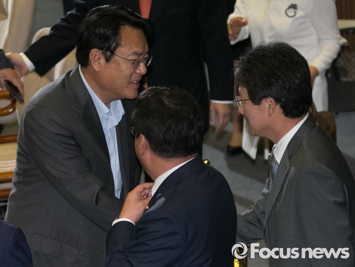 (서울=포커스뉴스) 21일 오전 서울 여의도 국회에서 열린 343회 국회(임시회) 4차 본회의에 참석한 정진석(왼쪽) 새누리당 원내대표와 유승민 의원이 인사하고 있다.