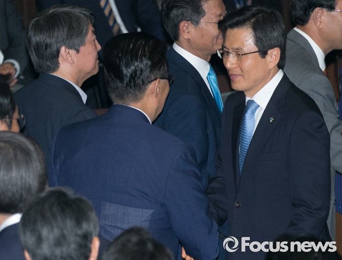 (서울=포커스뉴스) 21일 오전 서울 여의도 국회에서 열린 343회 국회(임시회) 4차 본회의에 참석한 황교안(오른쪽) 국무총리와 안철수(왼쪽) 국민의당 상임공동대표, 박지원 원내대표가 인사하고 있다.