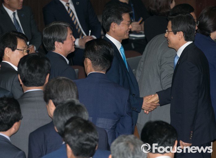 (서울=포커스뉴스) 21일 오전 서울 여의도 국회에서 열린 343회 국회(임시회) 4차 본회의에 참석한 황교안(오른쪽) 국무총리와 천정배 국민의당 공동대표가 인사하고 있다.