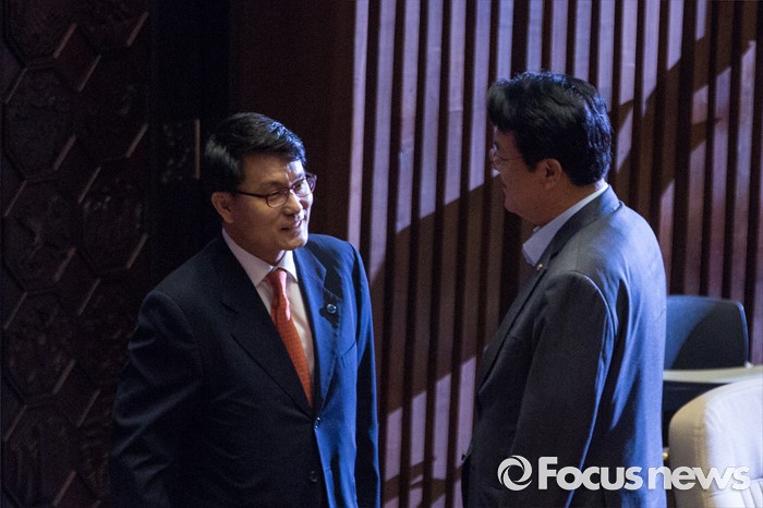 (서울=포커스뉴스) 정진석(오른쪽) 새누리당 원내대표와 윤상현 새누리당 의원이 21일 오전 서울 여의도 국회에서 열린 본회의에 참석해 대화를 나누고 있다.