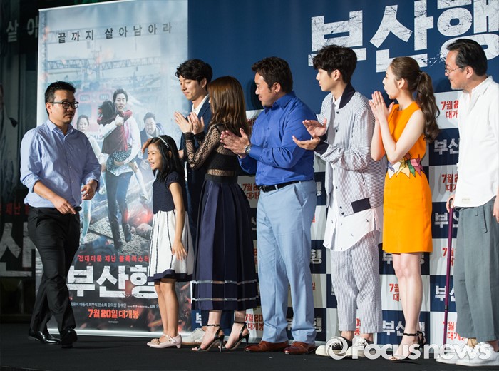 (서울=포커스뉴스) 21일 오전 서울 종로구 나인트리컨벤션에서 열린 영화 '부산행' 제작보고회에 참석한 연상호 감독이 출연진에게 박수를 받고 있다. 왼쪽부터 연상호 감독, 배우 김수안, 공유, 정유미, 마동석, 최우식, 안소희, 김의성.