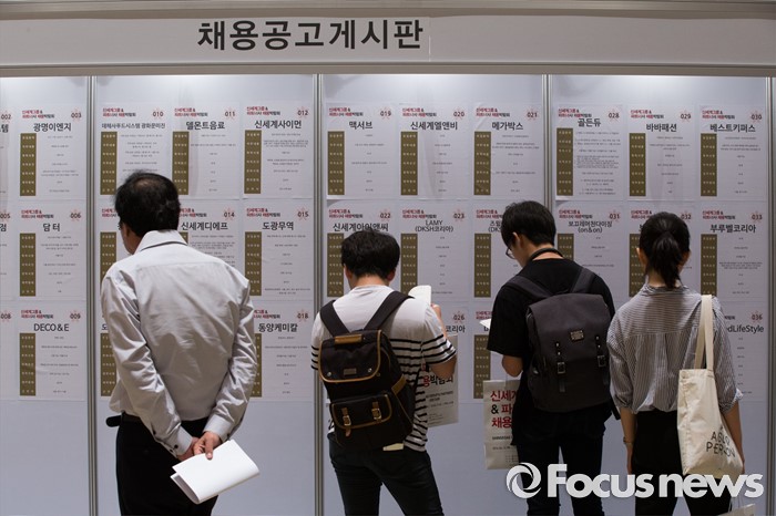 (서울=포커스뉴스) 21일 오후 서울 강남구 코엑스 D2홀에서 열린 신세계그룹&파트너사 채용박람회에서 구직자들이 채용공고게시판을 보고 있다.