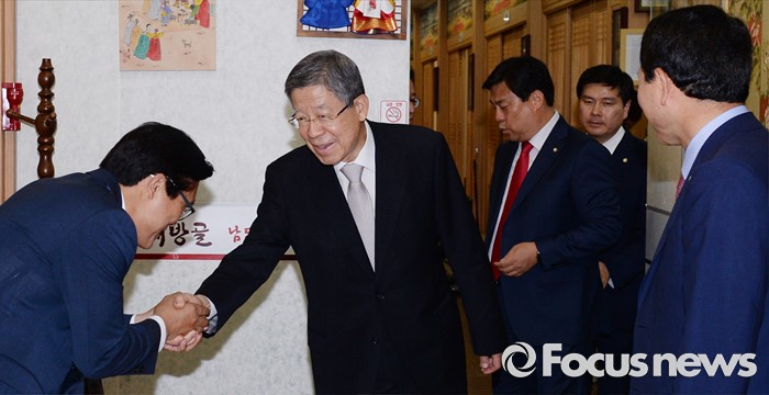(서울=포커스뉴스) 김희옥 새누리당 혁신비대위원장이 21일 오후 서울 여의도 한 식당에서 초선 의원들과의 오찬에 앞서 의원들과 인사하고 있다.