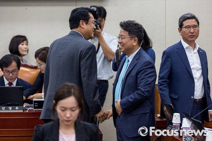 △ 대화 나누는 정진석 위원-이철희 간사