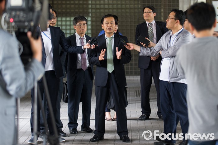 (서울=포커스뉴스) 채희준(오른쪽) 민주 사회를 위한 변호사모임 통일위원회 위원장이 21일 오후 서울 서초구 서울중앙지방법원에서 국가정보원 상대 북한 식당종업원 인신구제청구 1차 심문기일에 참석 전 취재진 질문에 답변하고 있다.