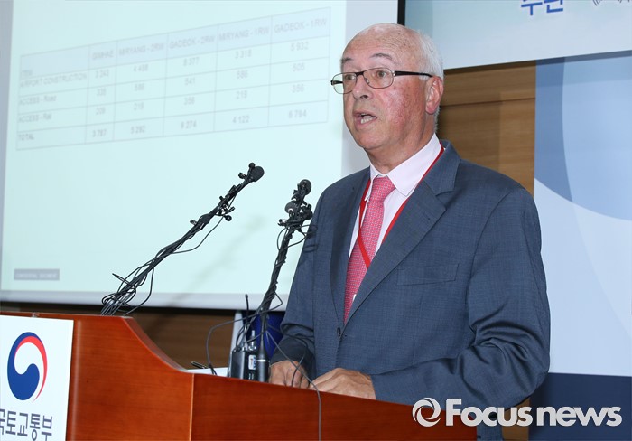 (세종=포커스뉴스) 장 마리 슈발리에 프랑스 파리공항공단자회사 ADPi 수석엔지니어가 21일 오후 세종시 정부세종청사 국토교통부 브리핑실에서 열린 동남권 신공항 타당성 검토 연구 최종 보고회에서 입지선정 결과를 발표하고 있다.