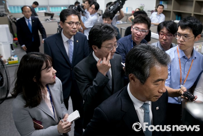 (서울=포커스뉴스) 정종섭(오른쪽부터), 유승민, 곽상도, 추경호 새누리당 의원이 21일 오후 서울 여의도 국회 의원회관 윤재옥 의원실에서 대구 지역 의원모임을 갖고 영남권 신공항 결과 발표를 지켜본 뒤 퇴장하고 있다.