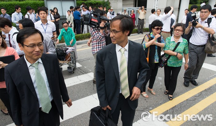 (서울=포커스뉴스) 채희준(왼쪽) 민주 사회를 위한 변호사모임 통일위원회 위원장과 이재화 변호사가 21일 오후 서울 서초구 서울중앙지방법원에서 국가정보원 상대 북한 식당종업원 인신구제청구 1차 심문기일을 마친 뒤 법원을 나서던 중 보수단체 대한민국구국채널 회원들의 항의를 받고 있다.