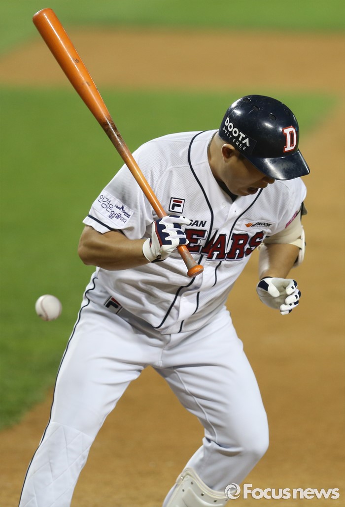 (서울=포커스뉴스) 12일 서울 잠실구장에서 열린 2016 프로야구 kt-두산 경기 8회말 무사 2루에서 대타로 나온 두산 양의지가 왼쪽 다리를 투구에 맞고 있다.