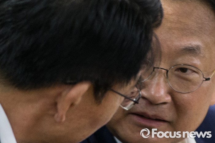 (서울=포커스뉴스) 22일 오전 서울 종로구 정부서울청사에서 열린 '신공항 후속조치 논의 관계장관회의에 참석한 유일호(오른쪽) 경제부총리가 강호인 국토교통부 장관과 대화를 하고 있다.
