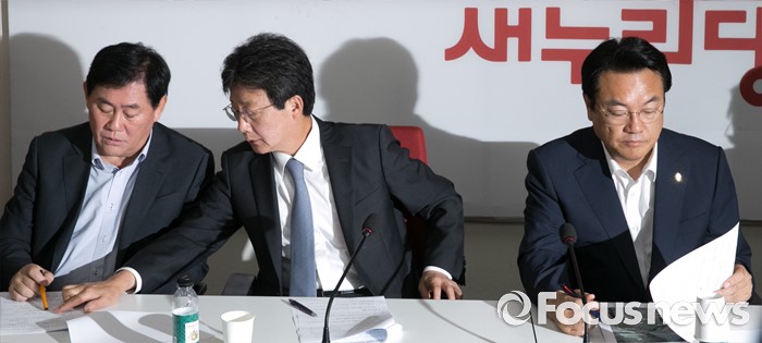 (서울=포커스뉴스) 22일 오전 서울 여의도 국회에서 열린 새누리당 신공항 관련 5개 시도 중진의원 간담회에 참석한 최경환(왼쪽), 유승민(가운데) 의원이 대화하고 있다. 오른쪽은 정진석 원내대표.