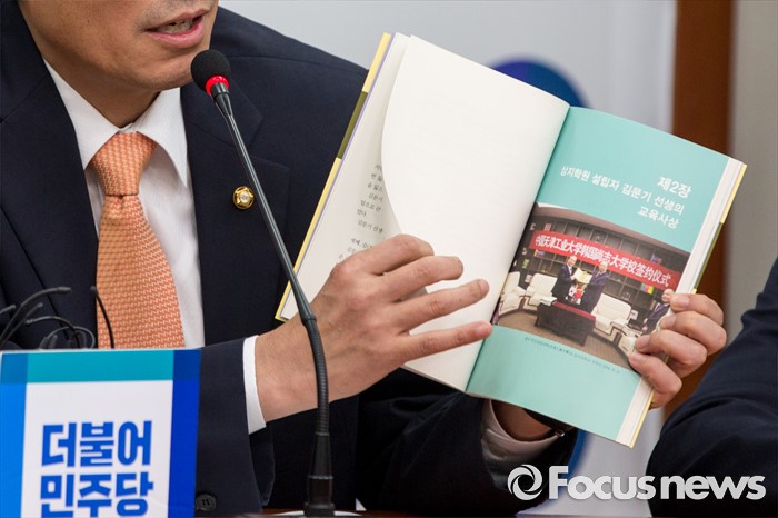 (서울=포커스뉴스) 우상호 더불어민주당 원내대표가 22일 오전 서울 여의도 국회에서 열린 비상대책위원회의에 참석해 '상지정신' 책자를 보이며 상시대학교 사태 관련 발언을 하고 있다.