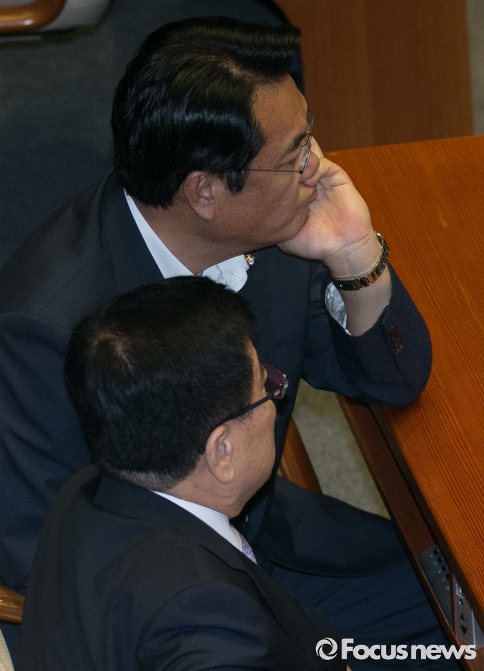 (서울=포커스뉴스) 22일 오전 서울 여의도 국회에서 열린 343회 국회(임시회) 5차 본회의에 참석한 정진석 새누리당 원내대표와 김광림 정책위의장이 안철수 국민의당 상임공동대표의 교섭단체 대표연설을 듣고 있다.