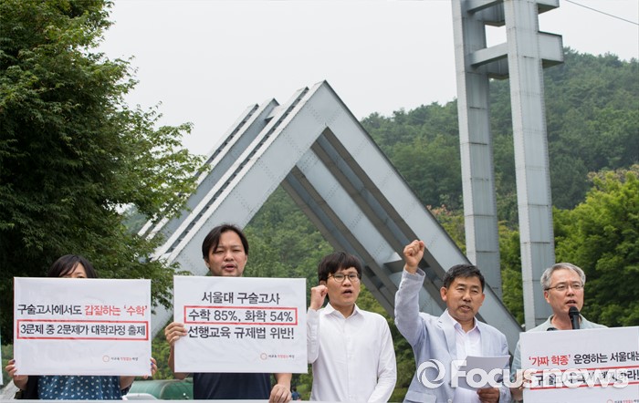 (서울=포커스뉴스) 22일 오전 서울대학교 정문 앞에서 시민단체 '사교육걱정없는세상' 회원들이 '2016학년도 서울대 수시 일반전형 구술고사 관련 실태 발표' 기자회견을 열고 있다.